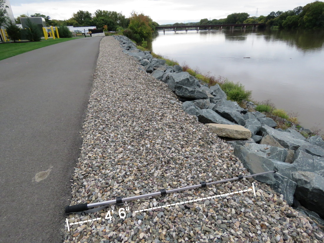 With only a loose gravel buffer of 3.5′ to 7′ on the river side of the trail (rather than the required 12 feet of graded buffer), and a very steep slope covered with sharp, rip-rap rocks, without guardrails installed, it certainly does not look safe enough to me. Part of my concern, of course, in addition to the normal mishaps on a busy shared use path, is the fact that the Trail passes within a couple yards of casino, restaurant and barroom patios, whose patrons will not all be sober, as well as by the Mohawk Harbor Marina and amphitheater.