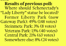 Schenectady Mayor Gary McCarthy had our replica statue of Lady Liberty dumped last summer at the corner of Erie Boulevard and Union Street, next to a train trestle and among a forest of poles. At the time, we wrote “