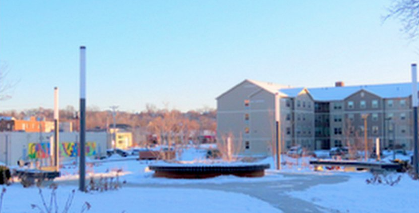 View from the East, December 20, 2021: The façade of the New Pump House has been moved much closer to the River, blocking the formerly expansive view of the West Lawn from east of the Old Pump House.