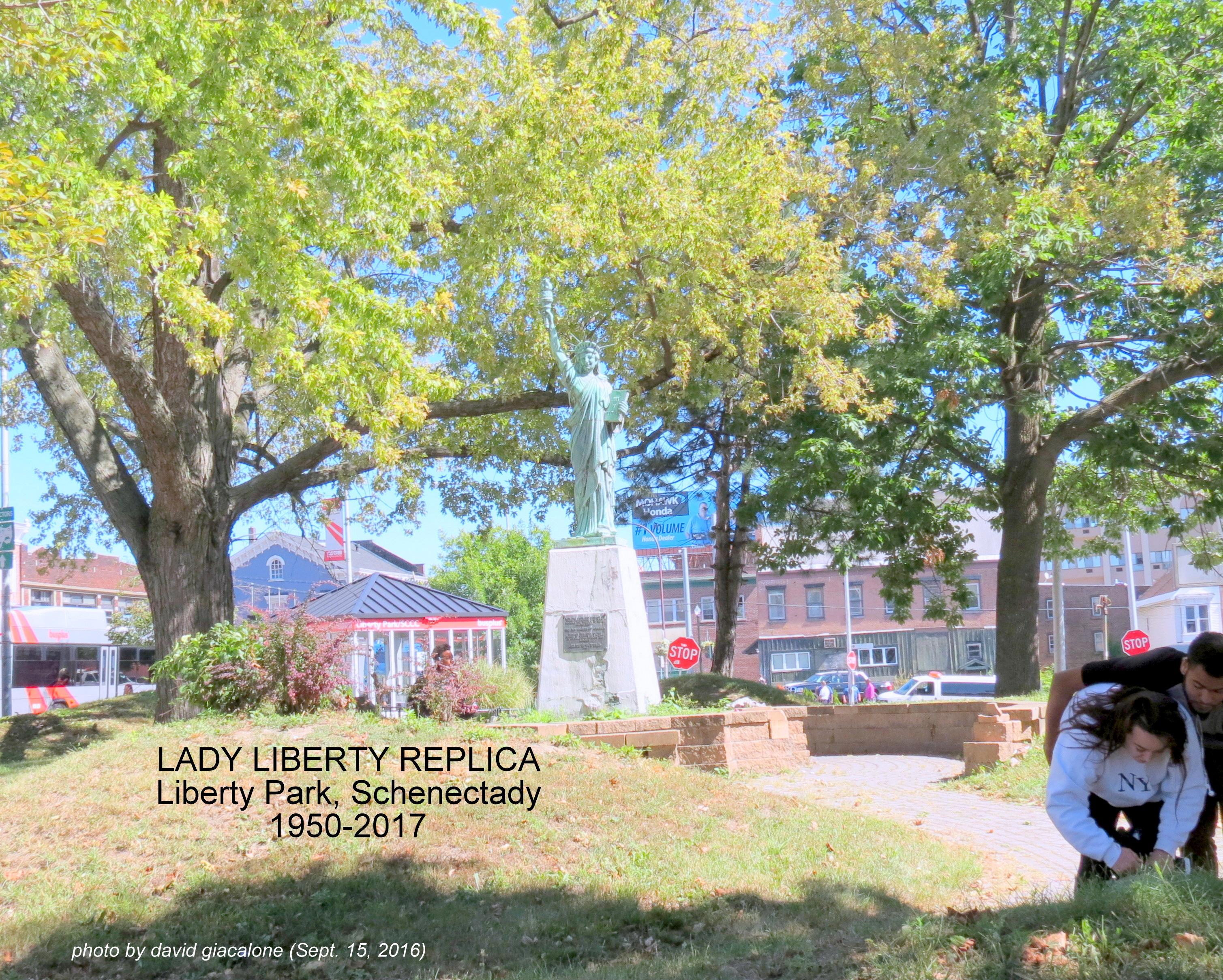 INTRODUCTION: The grand old tree that graced the West Lawn of Riverside Park for over a century was chopped down last week on Earth Day 2020, April 22. (Marked with a white asterisk in the two renderings above; 2017 photo on the right.) It was still healthy, with a diameter of 60 inches. Many Stockade residents and Riverside Park lovers where surprised, shocked, saddened. We were sure that significant tree would be preserved in the multi-million dollar pump station project being staged currently at the Park. We did know that a few “lesser” trees along the pump station’s original fence did need to come down to fit a new pump station on the lot of the old pump house. As would be expected, those lesser trees do not appear in the 2017 renderings, which are meant to show what a site will look like after the proposed construction is completed.