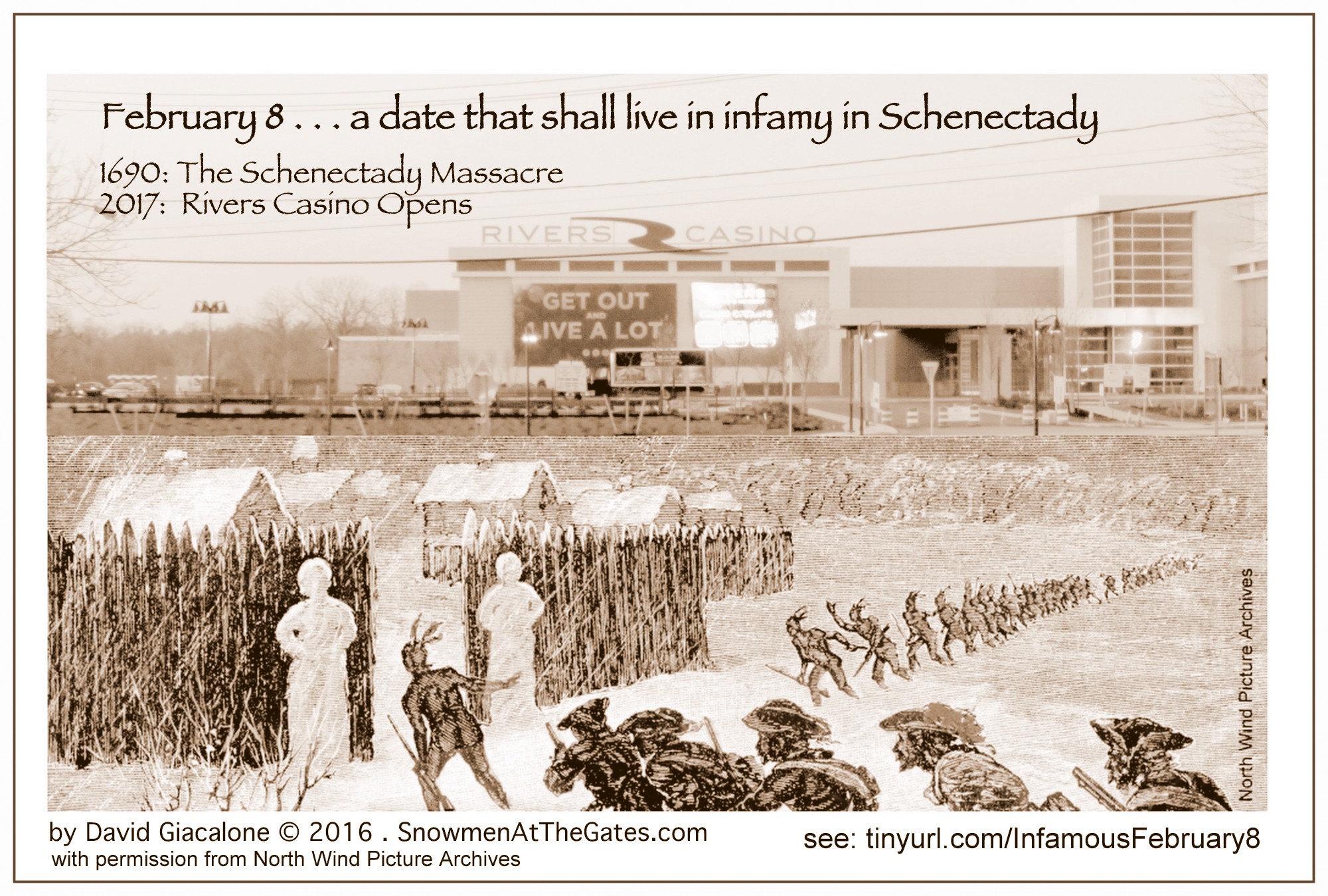 Ironically, two of our primary themes, Snowmen Leaders Allowing Danger to Enter Schenectady and Becoming a Casino Town, were further linked by the decision of Rush Street Gaming to open the Rivers Casino on February 8, 2017, the anniversary of the 1690 Massacre. See “our infamous February 8th“.