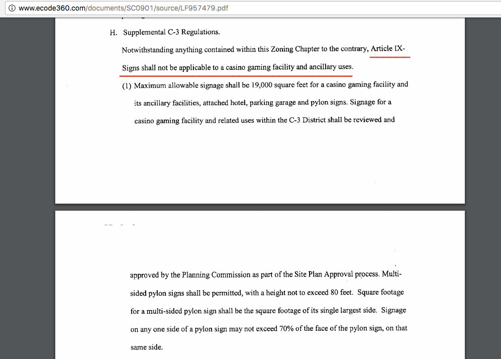 - Despite the statement to me by the Principal Planner earlier this week, Mohawk Harbor did not reduce the size of its proposed signs in deference to the need to seek a variance for each, which State law says must be the minimum increase required to meet the valid needs of the applicant. More worrisome, no Commission member spoke of the need for a variance, nor reminded Mohawk Harbor that only casino facility signs were exempted from the Zoning Code’s Article IX restrictions on the size of signs.