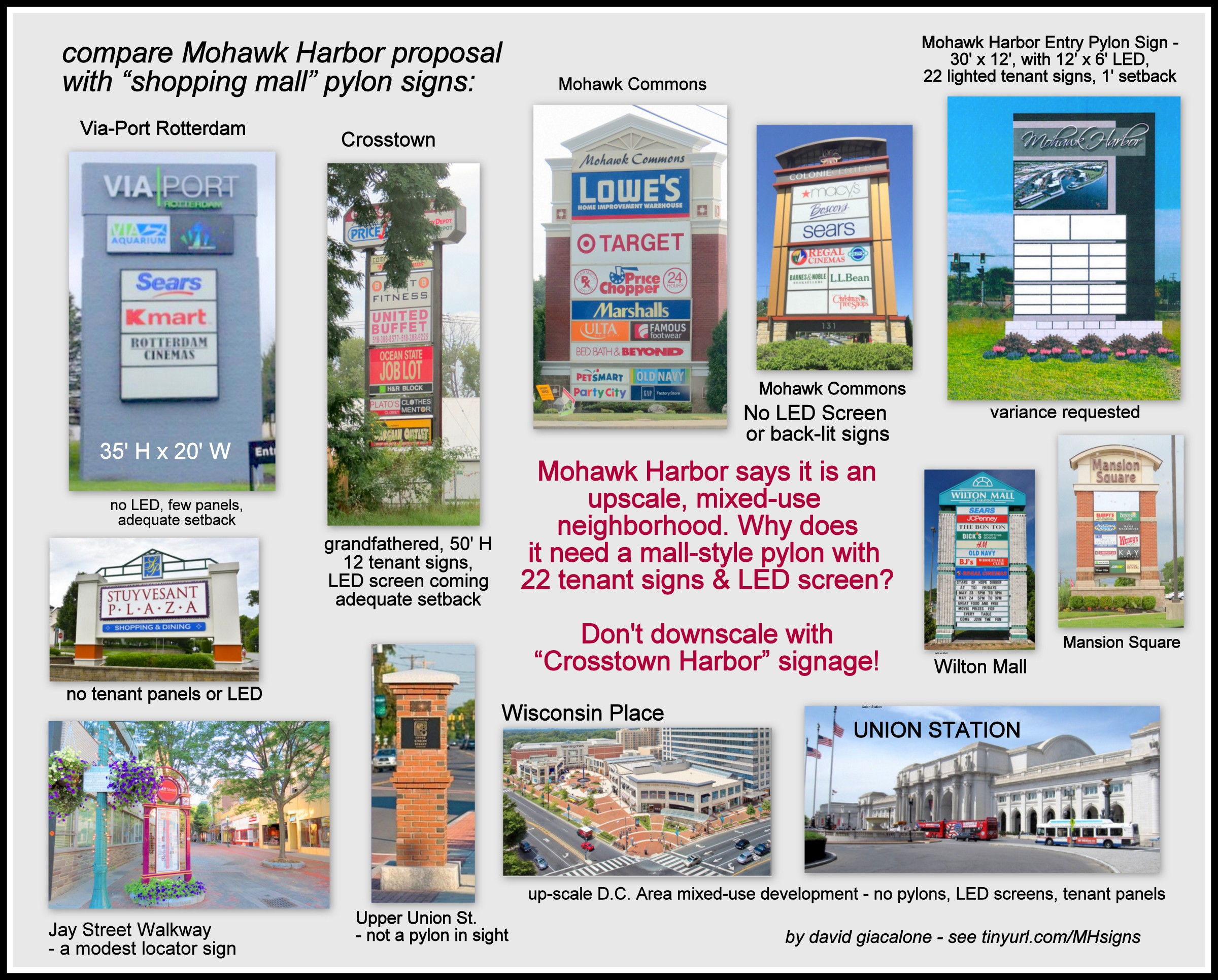 David Giacalone, proprietor of this website, stated that BZA should have made its own independent review of variance issues before the Planning Commission spent two months helping MH design a 30-foot sign for a 7-foot sign location. He also stressed that (1) Mohawk Harbor is asking for a shopping-mall-style sign despite touting the development as an upscale mixed-use residential and commercial neighborhood; he presented a collage (seen below) to make the point; (2) a large, bright sign so close to a busy, complicated roadway presents many safety issues, including distracting drivers (intentionally) and creating major glare; and (3) the Applicant could not show that its difficulty under the zoning code is not “self-created”, because Mohawk Harbor was intimately involved with drafting the revamping of the C-3 District rules two years ago, and specifically left the original C-3 signage limitations for non-casino signs. These and additional issues are more fully discussed below.