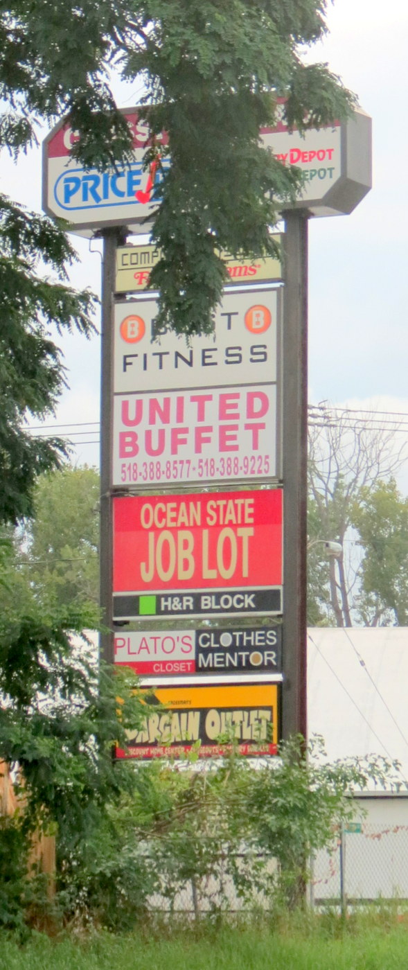 David Giacalone [proprietor of this website] stated that variances were needed, and that a large pylon with signs for 22 tenants would make upscale Mohawk Harbor look like any old shopping mall. [image to the right is Crosstown Plaza’s sign; with $480 million to spend, I am pretty sure the Lupe family would have developed a very tasteful plaza at Crosstown.] Giacalone reminded the Commission that they need to consider the safety elements of having a large LED screen, plus the lighted tenant signs, just a few feet from a busy road.