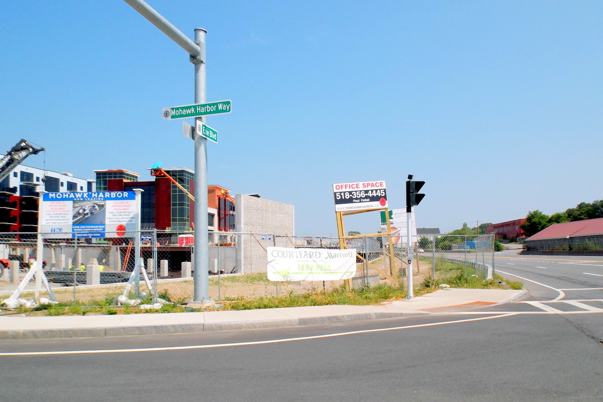post BZA update (10 PM, Oct. 4, 2017): This evening, the Schenectady Board of Zoning Appeals granted a variance for a “monument’ sign at the entrance to Mohawk Harbor at Mohawk Harbor Way and Erie Boulevard, but denied the request for a variance to permit a 30’ tall pylon sign along Erie Blvd, that had a large LCD screen and 22 lighted “tenant signs”. [But see, “BZA pylon flip-flop“.]