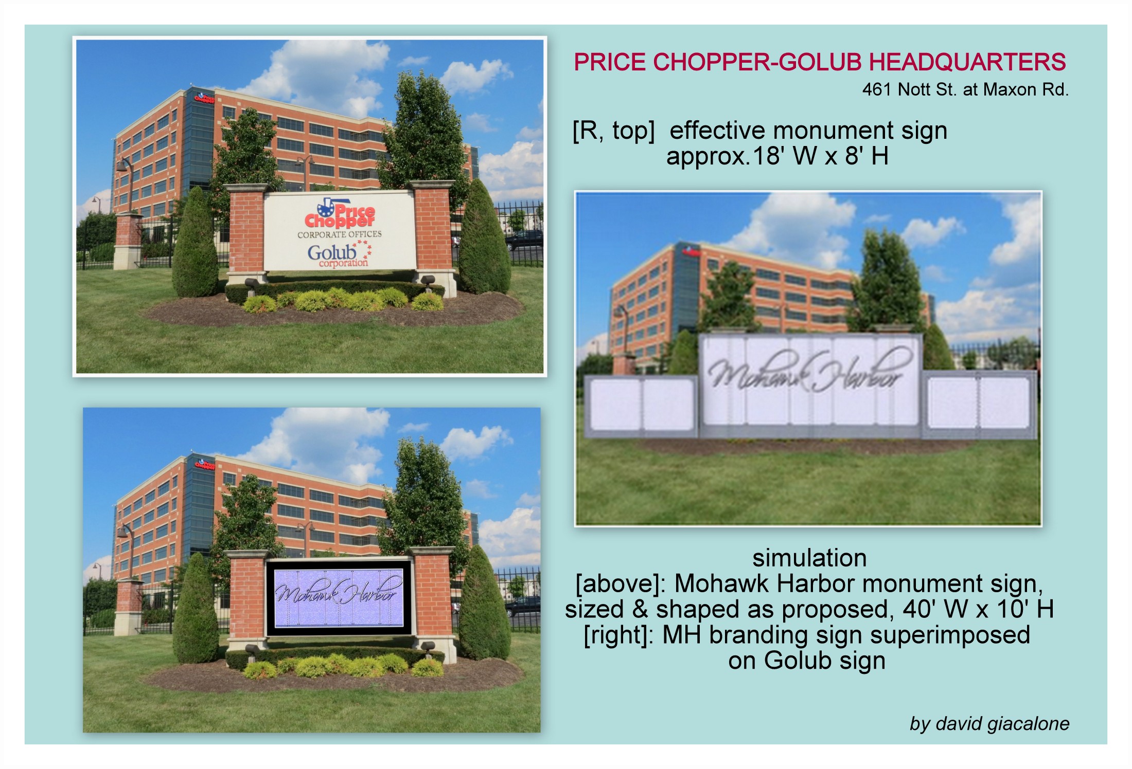 Similar questions need to be asked about the appropriate size of the monument sign at the entryway to Mohawk Harbor. Just a block to the east, on Nott Street, the Golub Corporation has its headquarters, for its Price Chopper and Market 32 chains of supermarkets, in a building developed and owned by the Galesi Group. As you the see in the next collage, it does rather well making itself known to passersby with a freestanding branding sign no larger than 8′ H by 18′ W.