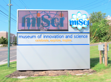 How large does an effective Branding Sign have to be, especially for a destination-establishment that constantly receives boatloads of free media exposure, for the entire complex and for each new “tenant” business? MiSci, the Schenectady Museum of Innovation and Science, gets far less publicity, but its branding pylon sign on Nott Terrace seems to do the job well, at 12′ W and 10′ H, with an LED screen about 9′ W and 3.5′ tall. See the image at the right. The following collage shows what a Mohawk Harbor sign of the same size might look like at miSci’s Nott Terrace location, and what it would be like at the 32′ by 14′ dimensions requested the the Applicant, including a 12′ by 6′ LED screen. [click on the collage for a larger version]