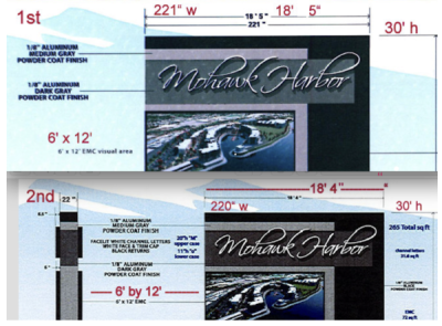 - Commissioner Bradley Lewis correctly pointed out that the proposed large pylon does not actually have the name Mohawk Harbor prominently displayed, so as to alert drivers they are approaching the development.