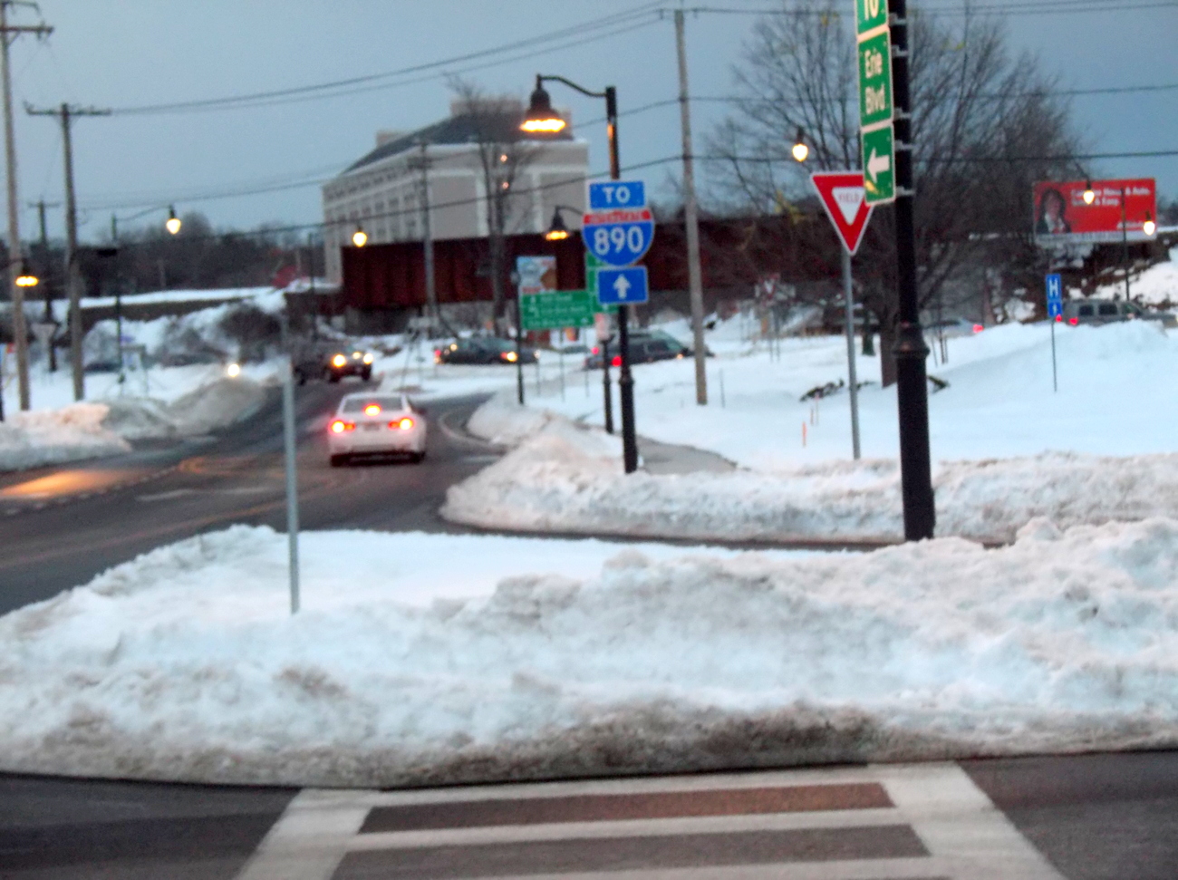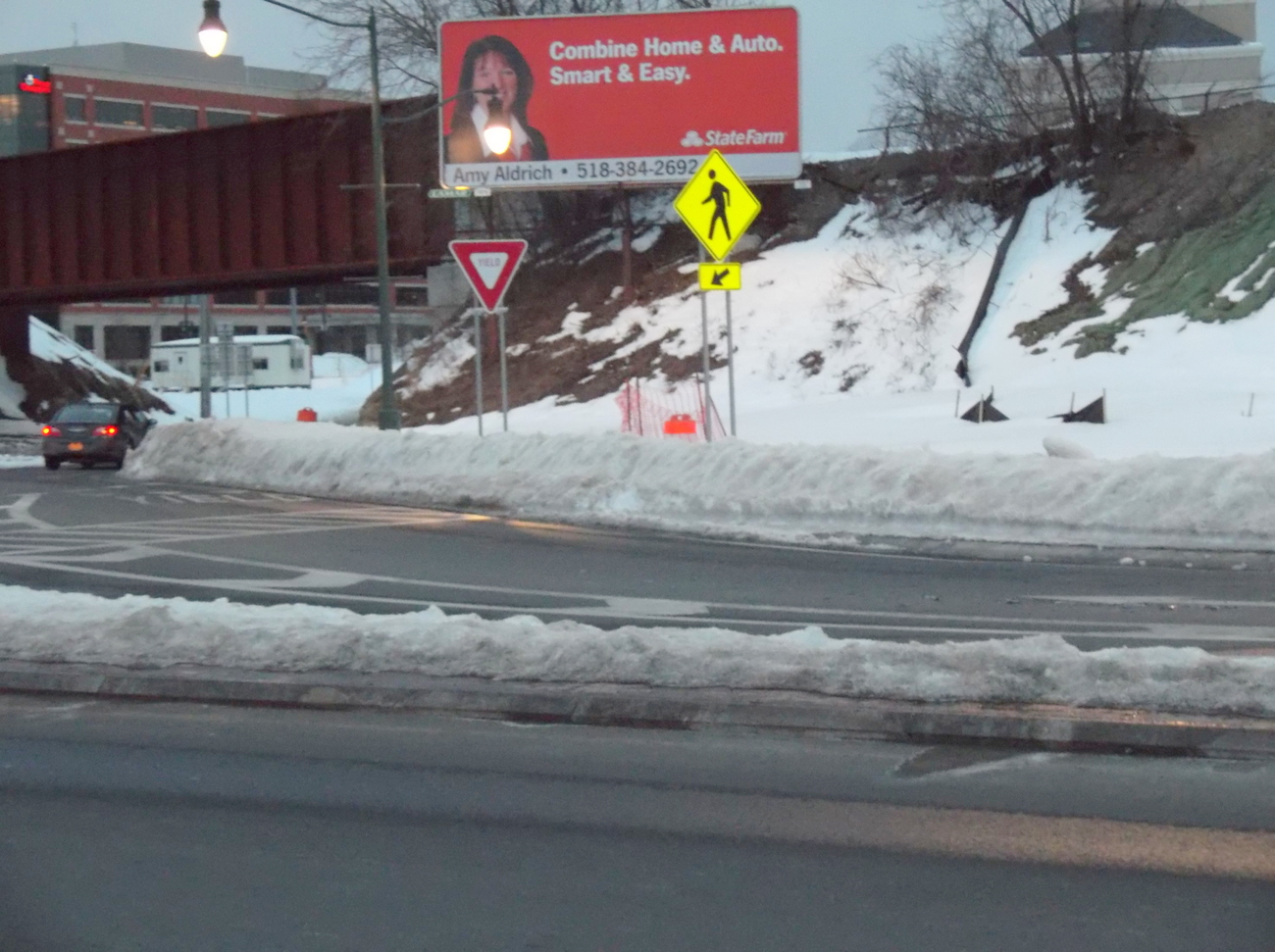 DSCF2599-001 . . [L] Most daunting was trying to head south on Erie Boulevard on foot. Once past the overhead walkway, virtually all of the sidewalk had the full 19 inches of snow, all the way to Stewart’s, at Green Street. If a business had shoveled at its driveway, the curb at the intersection and crosswalk was piled even higher. I was left to walking at sunset on the side of a very busy road, with fast traffic and lots of puddles. Not pedestrian-friendly, Mr. Mayor. Not a good introduction to visitors on the ease of getting from Mohawk Harbor to our much-touted downtown Renaissance.