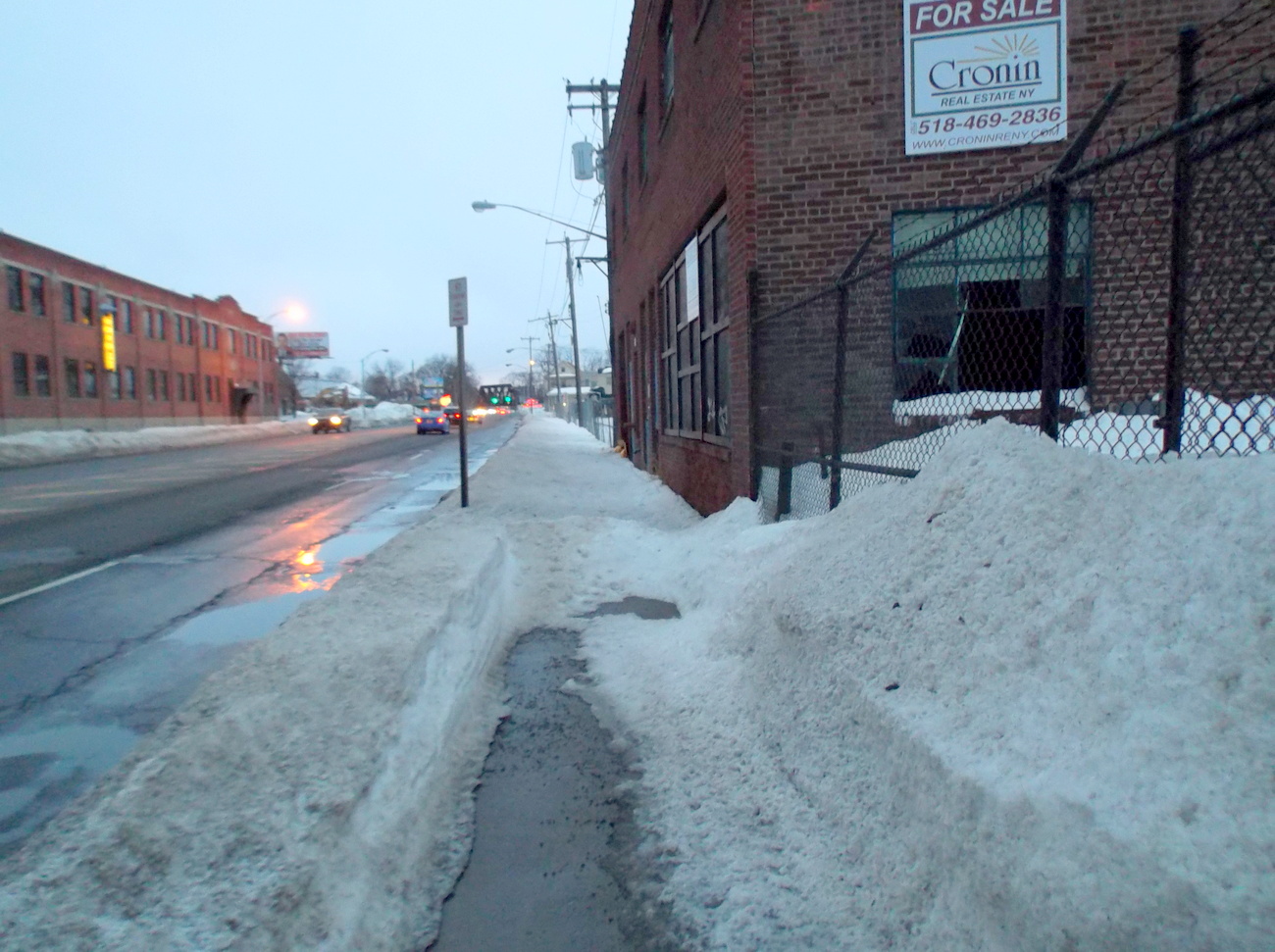 “Walkable Schenectady”?  Our Mayor likes to brag about our “walkable City”, as do the gents at Metroplex. A week after the mid-March snow storm ended, many crosswalks in downtown Schenectady were clogged at the curb with snow, and many sidewalks in downtown Schenectady were left unshoveled. The snow had stopped Wednesday morning, but on Saturday evening, March 18, I made the mistake of trying to walk from my Stockade home up Front Street, to Mohawk Harbor and then up Erie Blvd. I spent a lot of time precariously switching from sidewalk to street.