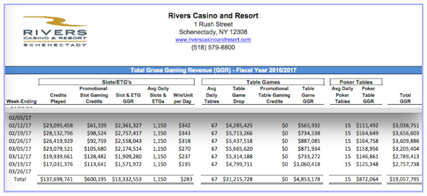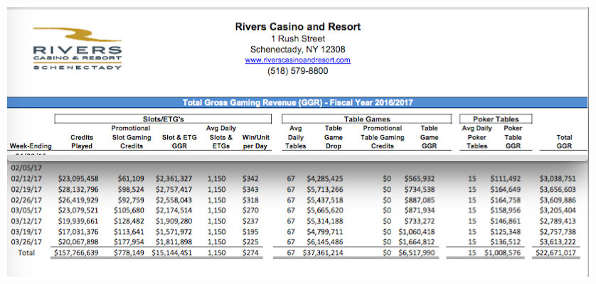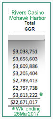 • RiversSchdyRevs31Mar2017 update (March 31, 2017): For the week ending March 26, 2017, Schenectady’s Rivers Casino had its first increase in revenues in over a month. The total GRR, $3,613, 222, was the best take for the Casino since its first full week, with a 31% increase over the prior week’s dismal GRR, which was the Casino’s lowest ever. As you can see from the composite below of the Rivers Casino Total Gross Gaming Revenues Report, there were significant increases in slots (16%) and table games (57%!), with poker revenues up almost 9%.